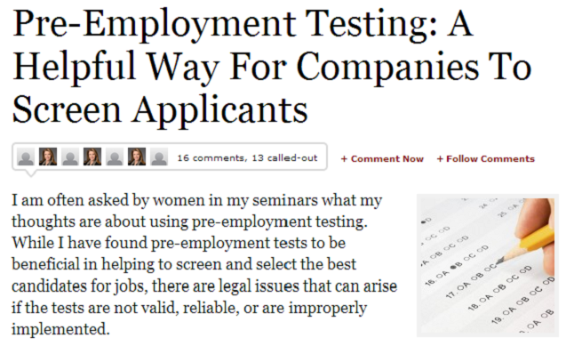 (Source: Pre-Employment Testing: A Helpful Way For Companies To Screen Applicants, Forbes.com, September 13, 2011)